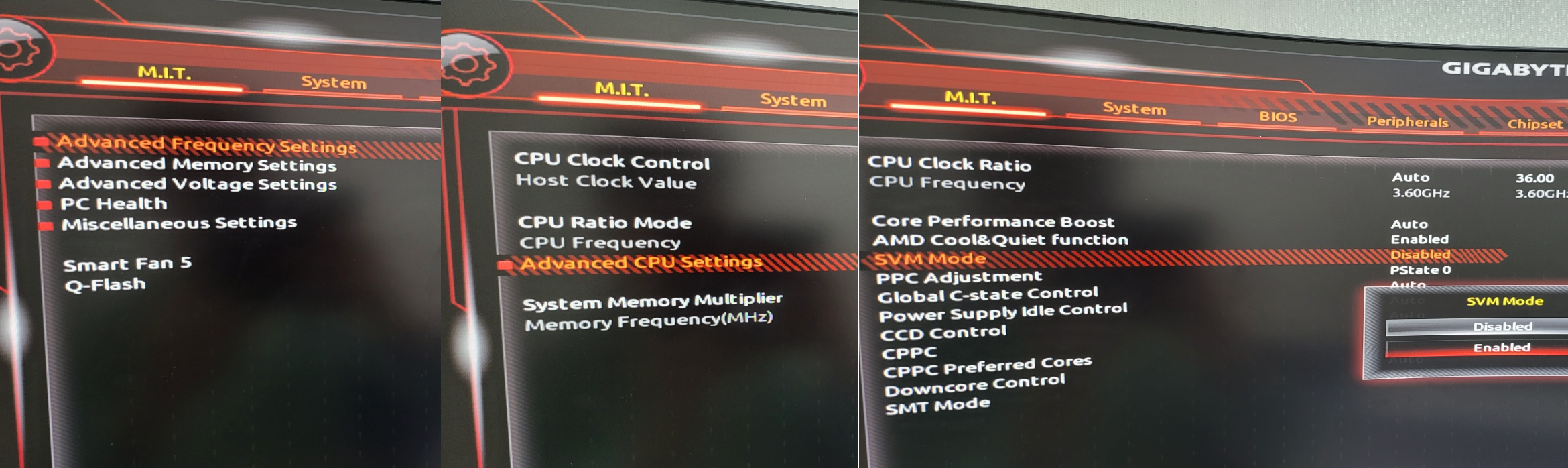 * M.I.T. → Advanced Frequency Settings → Advanced CPU Settings → SVM Mode Enabled