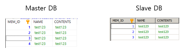 위 SQL 실행시 Master DB에서는 MEM_ID 4인 데이터가 생성됐지만,