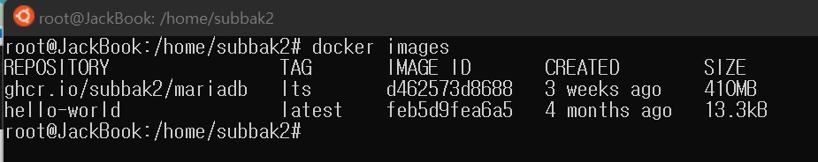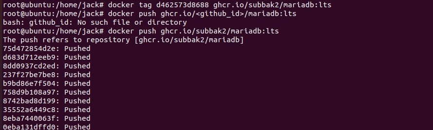 root@ubuntu:/home/jack# docker tag d462573d8688 ghcr.io/subbak2/mariadb:lts