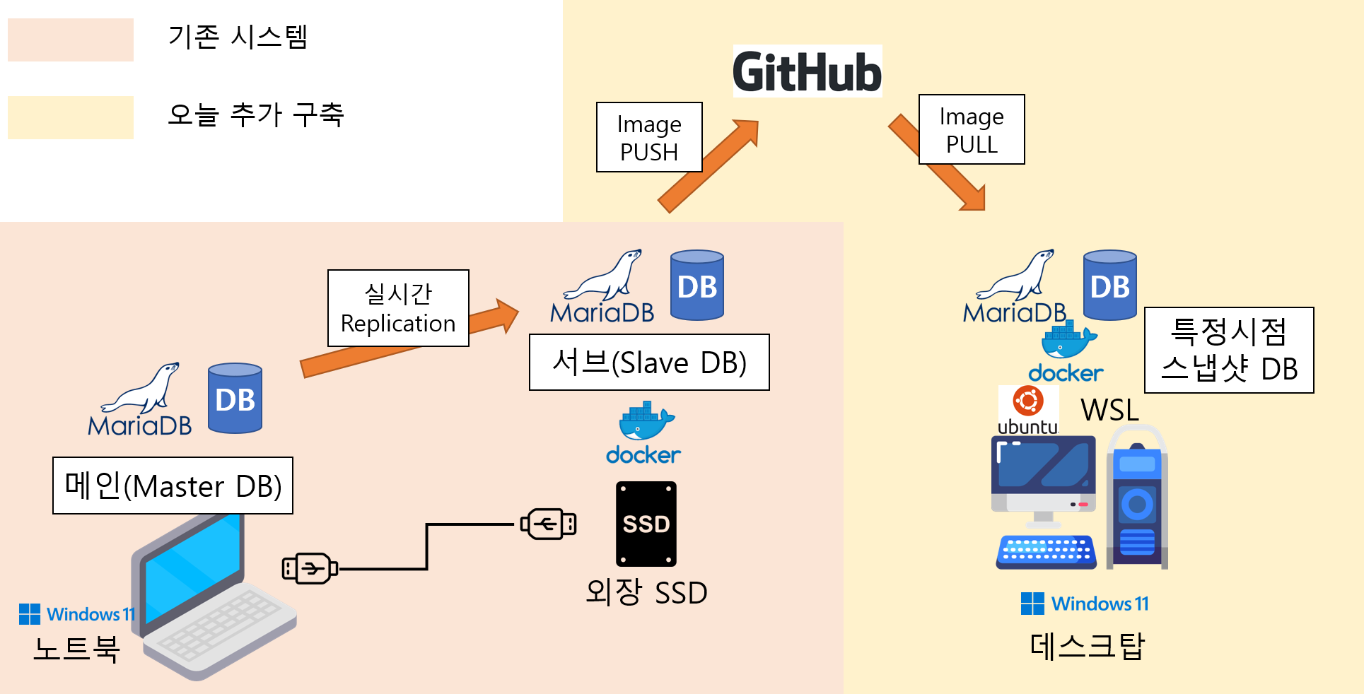 외장 SSD에 Docker로 실행 중인 Slave DB에 실시간 Replication이 되는 구조이다.