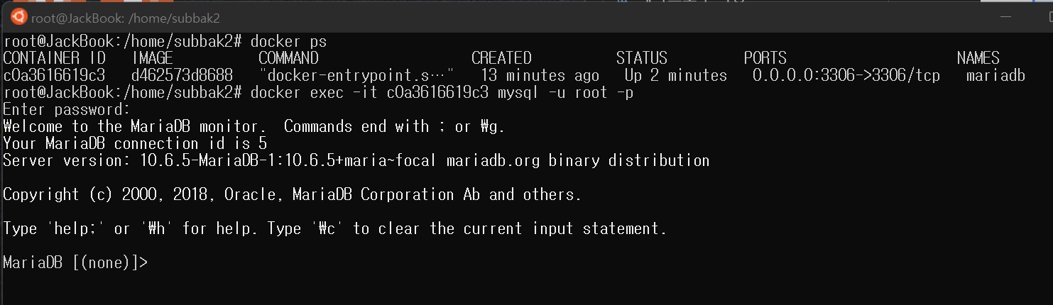 -- 실제실행. 포트 3306, root pw : mariadb로 실행할 경우