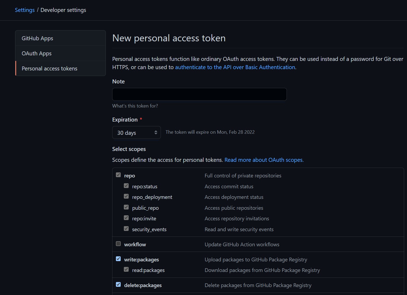 repo, packages의 권한을 부여했다.