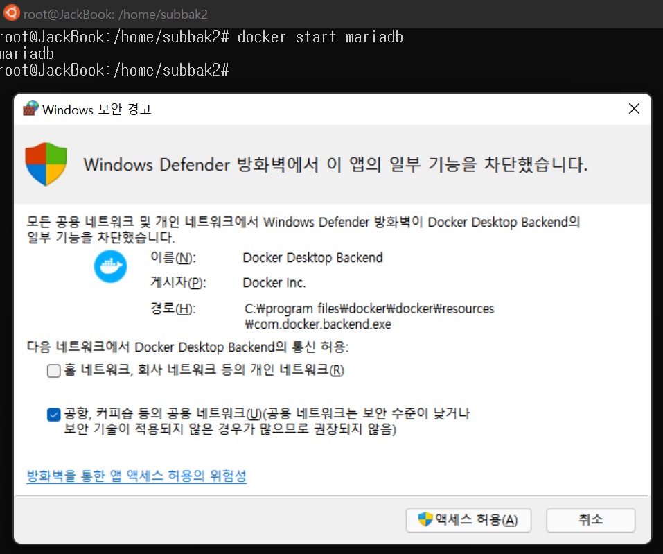 * docker에서 서비스 실행시에도 Windows 방화벽을 open해야한다.