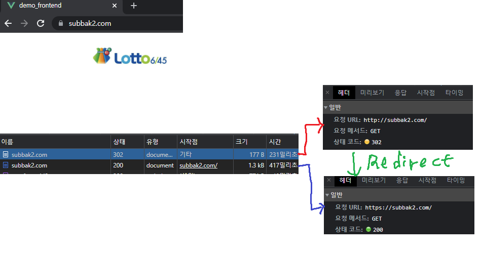 3) 브라우저 개발자도구에서 302 Redirect를 통한 https 접속 확인 ( URL : http → https )