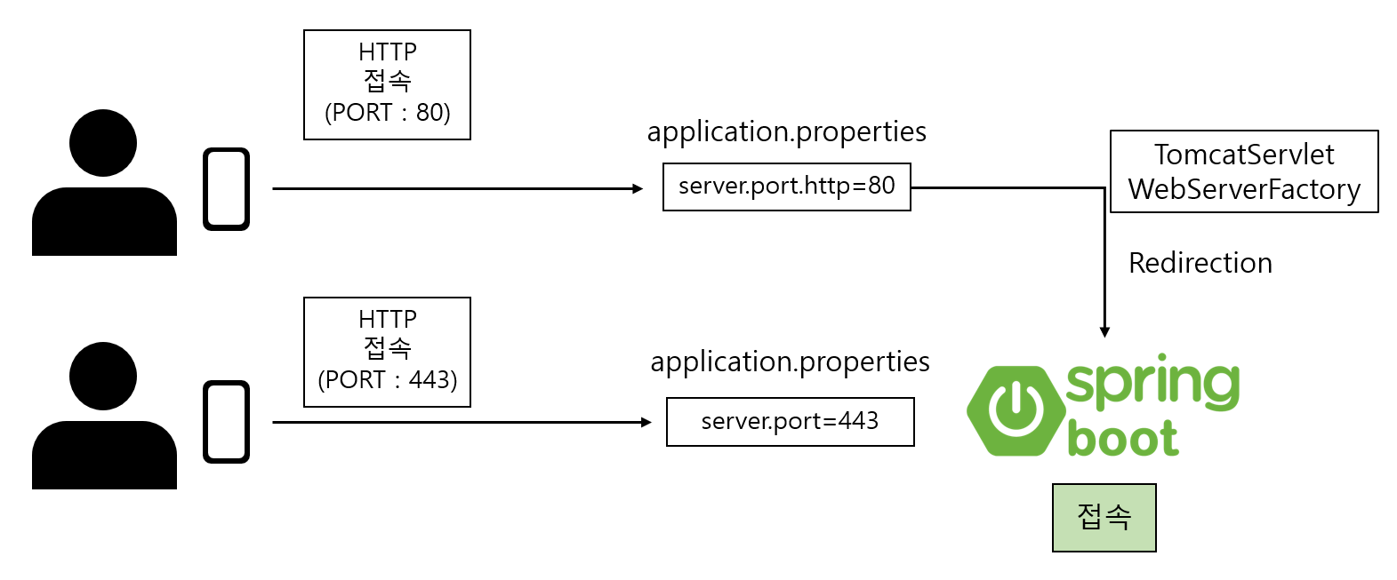 1) Spring Boot에 @Configuration 파일을 생성해 TomcatServletWebServerFactory의 설정을 변경 → 리다이렉션 적용