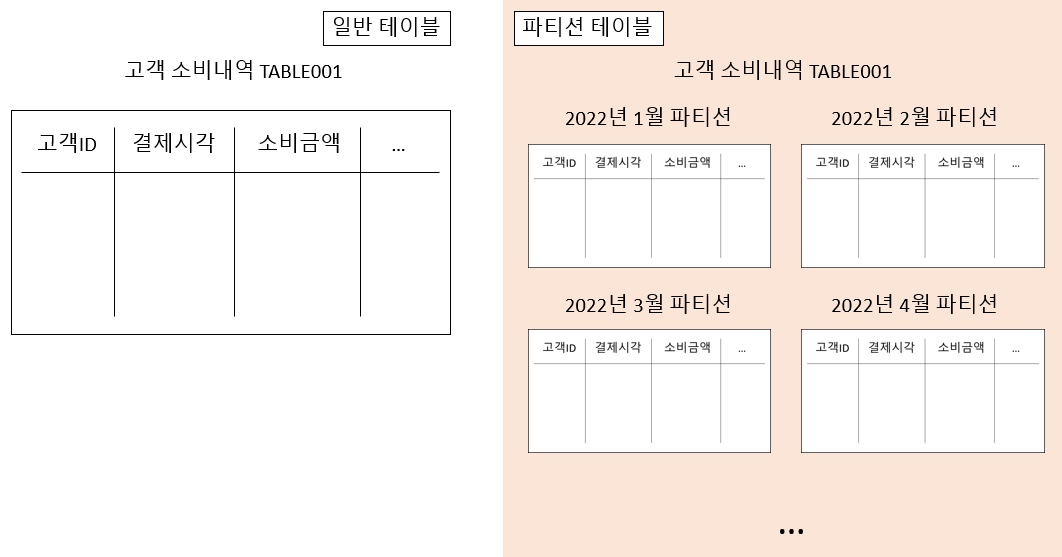 아래 그림처럼 결제시각에 따라 월 RANGE 파티션으로 구성할 수 있다.