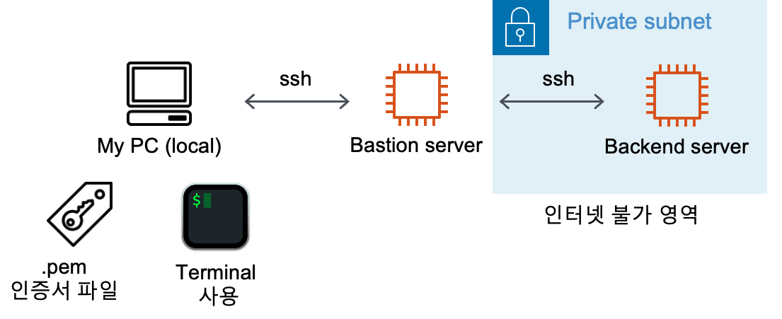 - 최초에 시도한 방법 : Bastion server에 ssh 접속 후, ssh 명령어를 통해 Backend server에 접속