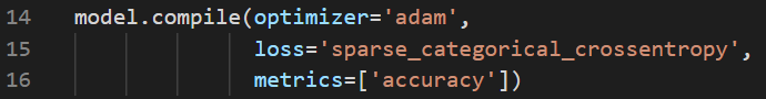 Line 14~16 : 위에서 만든 모델을 Compile 즉, 실행 시킵니다.