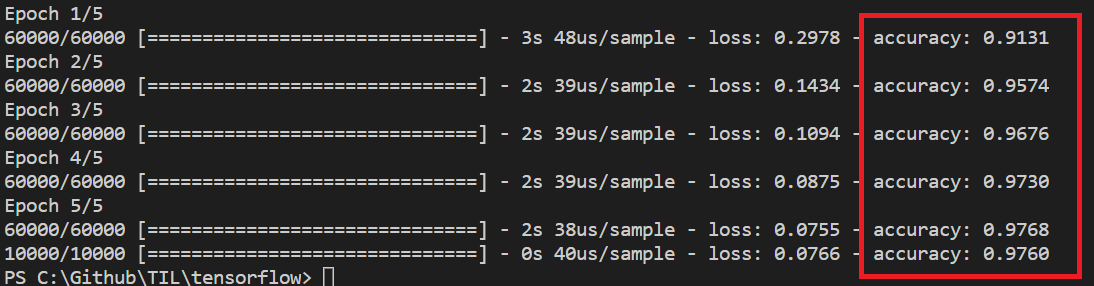 즉, 5바퀴를 돌면서 60,000개 데이터를 넣어서 학습을 진행했고 각 학습별 loss와 accuracy가 나옵니다.
