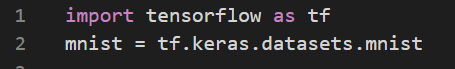 Line 4 : 이미 작성된 데이터베이스인 mnist에서 데이터를 불러와서 (x_train, y_train), (x_test, y_test)에 넣어줍니다.