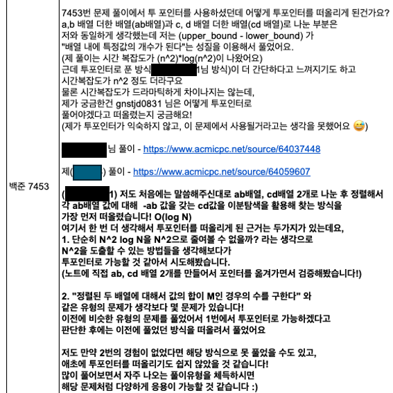 그룹을 만들어 문제를 함께 풀고, 다른 사람의 코드를 확인하고, 실행시간을 보며 최적화를 고민했다.