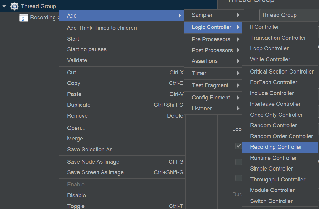 2) Recording 방식으로 Script 작성할 경우 Thread Group에 Recording Controller 추가