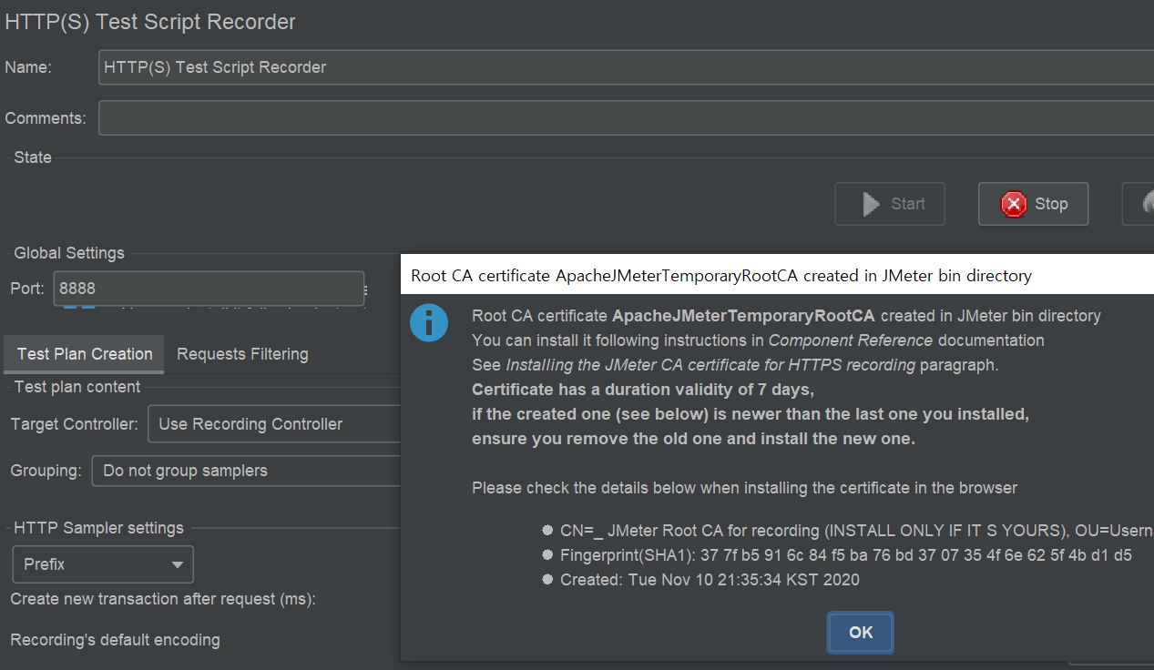 4) HTTP(S) Test Script Recorder에서 Proxy 포트 설정 후 Start 클릭하고