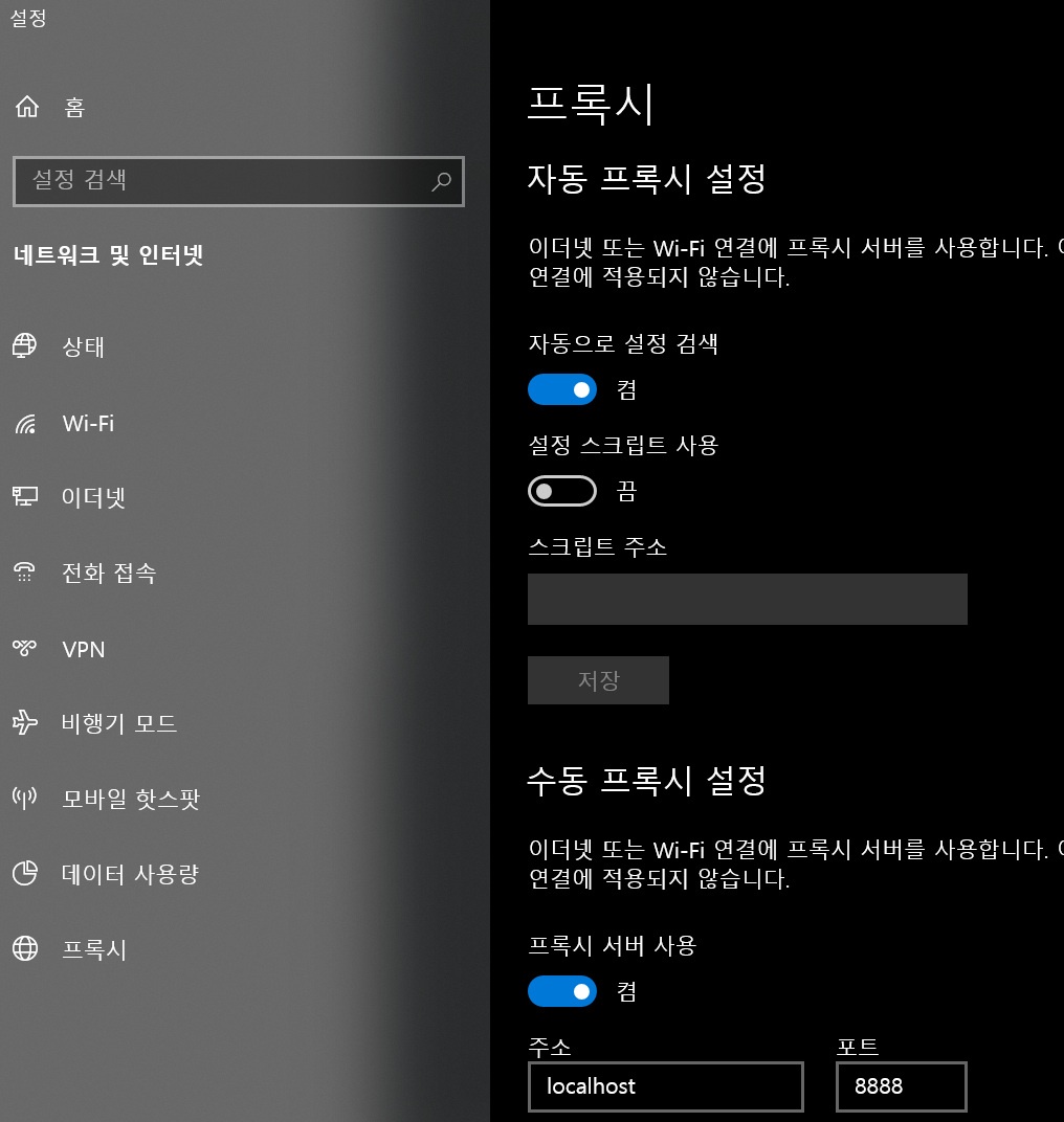 테스트 컴퓨터에서도 제어판 > 프록시 설정 포트 동일하게 맞추기