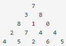 맨 위층 7부터 시작해서 아래에 있는 수 중 하나를 선택하여 아래층으로 내려올 때, 이제까지 선택된 수의 합이 최대가 되는 경로를 구하는 프로그램을 작성하라. 아래층에 있는 수는 현재 층에서 선택된 수의 대각선 왼쪽 또는 대각선 오른쪽에 있는 것 중에서만 선택할 수 있다.