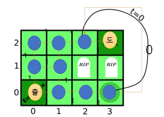 묘지가 위와 같이 생긴 경우(문제의 두 번째 예제)를 살펴보자. 묘비는 (2,1)와 (3,1)에 있고, 귀신 구멍은 0초만에 (3,0)로 들어가서 (2,2)에서 나오는 구멍 하나가 있다. 묘지를 빠져나오는데 걸리는 가장 빠른 시간은 4초이며, 다음과 같다.