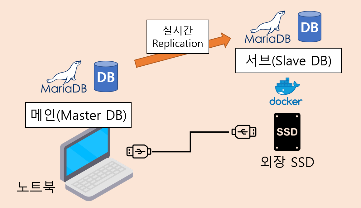 외장 SSD에 Docker로 실행 중인 Slave DB에 실시간 Replication이 되는 구조이다.