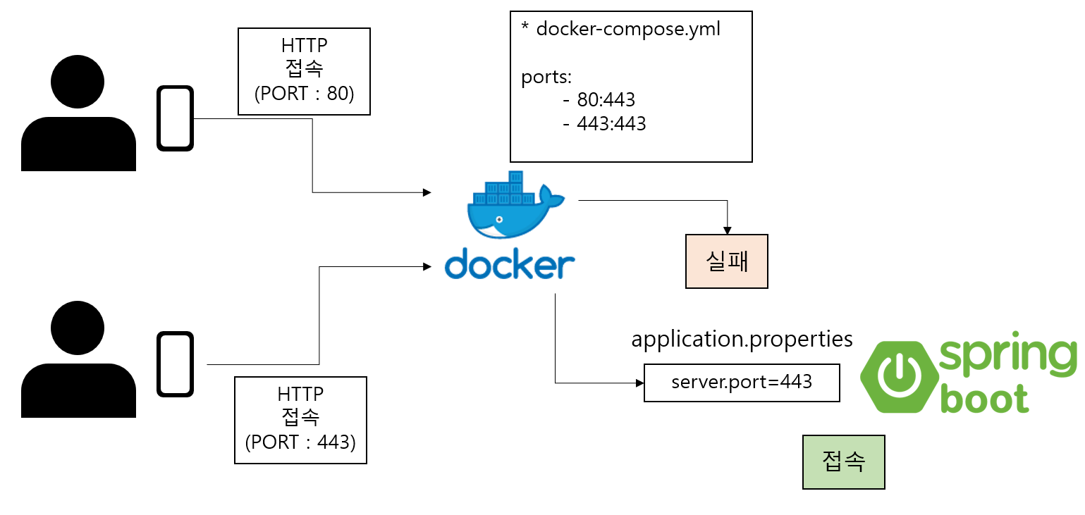 → docker-compose.yml에서 ports 부분에 80:443, 443:443 으로 설정