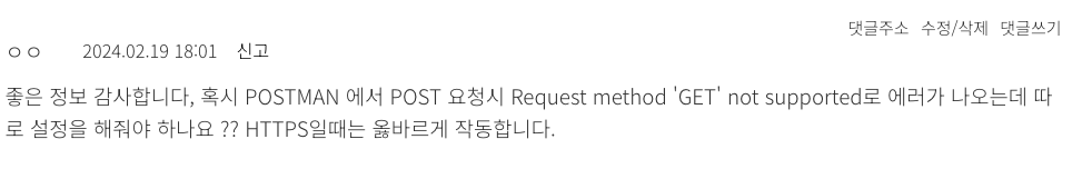 위 방법은 302 방식으로 redirect 하기 때문에 POST로 요청하더라도 redirect 과정에서 메소드가 GET으로 바뀐다는 단점이 있습니다.