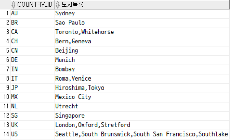 SELECT COUNTRY_ID, WM_CONCAT(CITY) AS 도시목록 FROM HR.LOCATIONS GROUP BY COUNTRY_ID ORDER BY COUNTRY_ID;