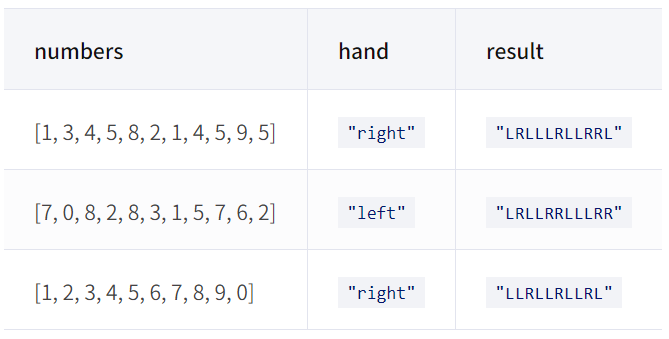 - 왼손 엄지손가락을 사용한 경우는 L, 오른손 엄지손가락을 사용한 경우는 R을 순서대로 이어붙여 문자열 형태로 return 해주세요.
