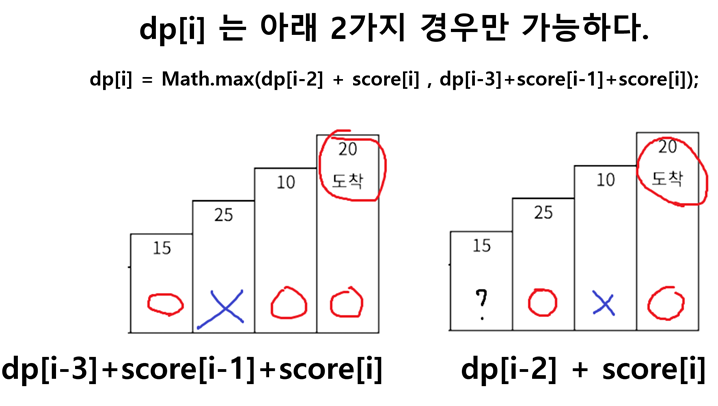 // 2) 파워(2칸) 점프로 온 경우 dp[i-2] + score[i]