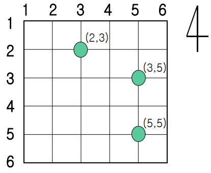 예를 들어 앞의 그림처럼 N=6인 경우, 처리해야 하는 사건들이 3개 있고 그 사건들이 발생된 위치 를 순서대로 (3, 5), (5, 5), (2, 3)이라고 하자. (3, 5)의 사건을 경찰차2에 맡기고 (5, 5)의 사건도 경찰차2에 맡기며, (2, 3)의 사건을 경찰차1에 맡기면 두 차가 이동한 거리의 합은 4 + 2 + 3 = 9가 되 고, 더 이상 줄일 수는 없다.